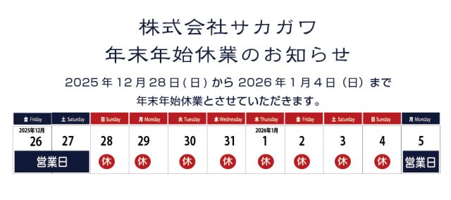 株式会社サカガワでは年末年始休暇のため下記日程を休業させていただきます。